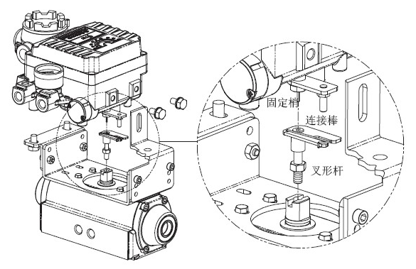 4,設定好叉形桿后,順時針方向擰緊叉形桿下面的固定螺絲。把閥門定位器安裝在支架上。閥門定位器放置在支架上方時,主軸下面的固定梢對準叉形桿上方的中心孔內,同時把主軸反饋桿上的連接棒插入到叉形桿的插槽。這是為了讓閥門定位器的主軸和氣缸軸的中心一致,如果中心沒有對準,那么閥門定位器的主軸上產生負荷力,影響產品的內構成,因此請正確對準中心。